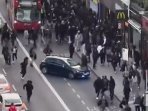 Two teenage girls have been arrested for assault after crowds flooded a London high street as part of a social media 'link-up'.
